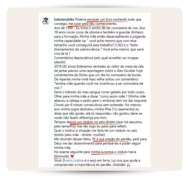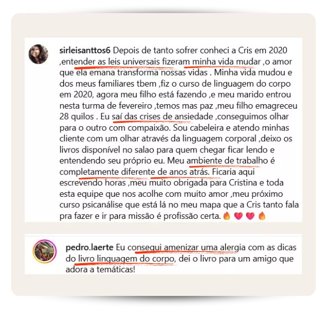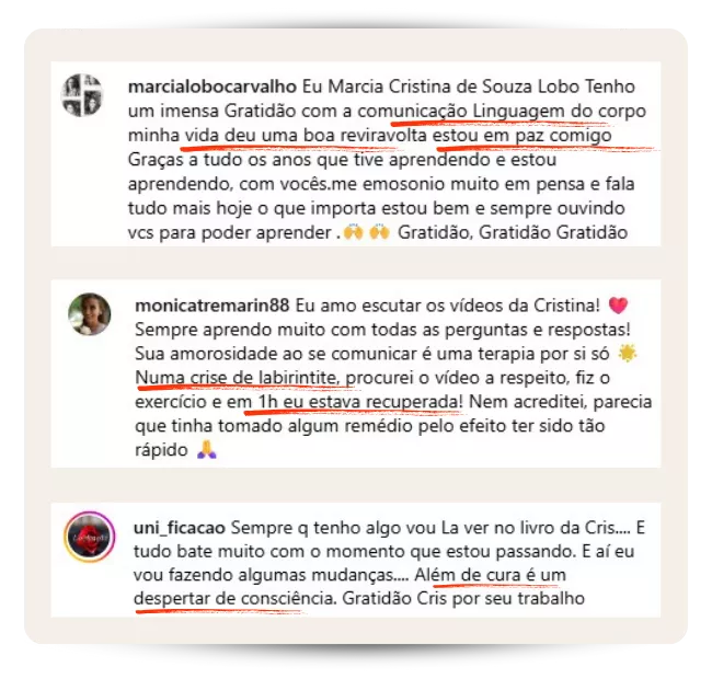 A Linguagem do Corpo - Método C.A.I.R.O. criado pela Cristina Cairo, é um caminho complementar de autoconhecimento, que ensina você a compreender as mensagens emocionais por trás dos sintomas físicos, para que possa buscar a cura integral — corpo, mente e espírito.