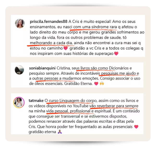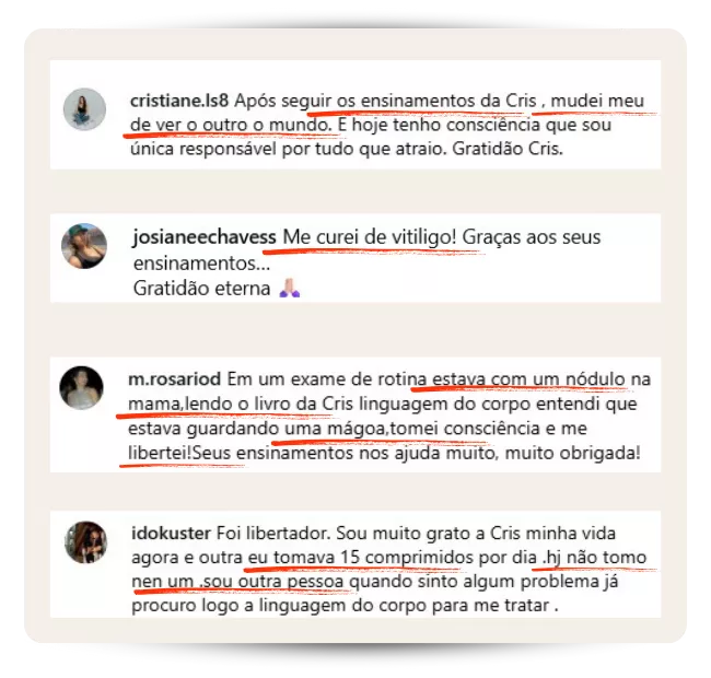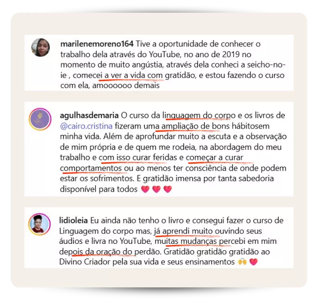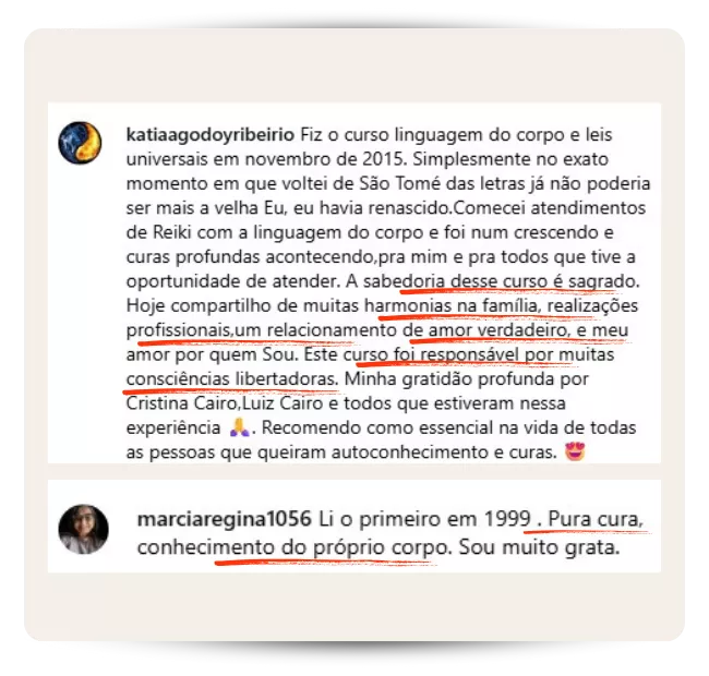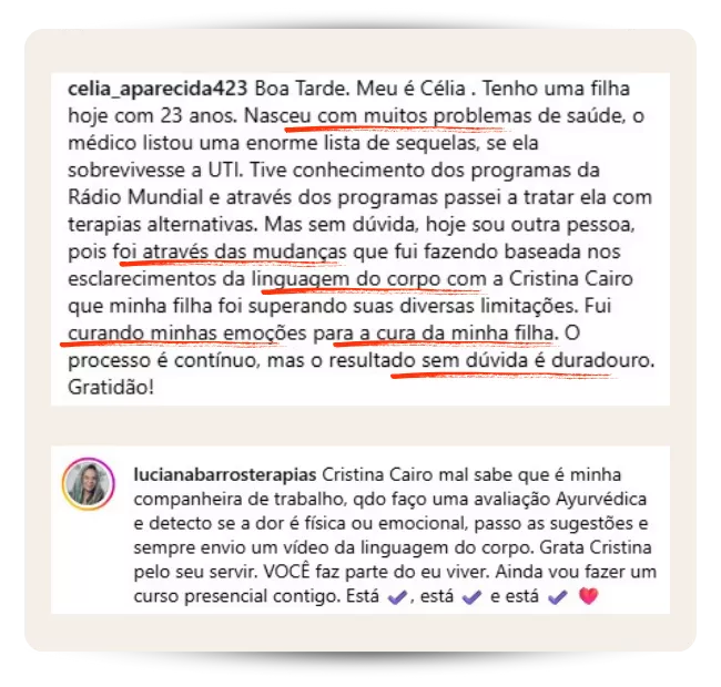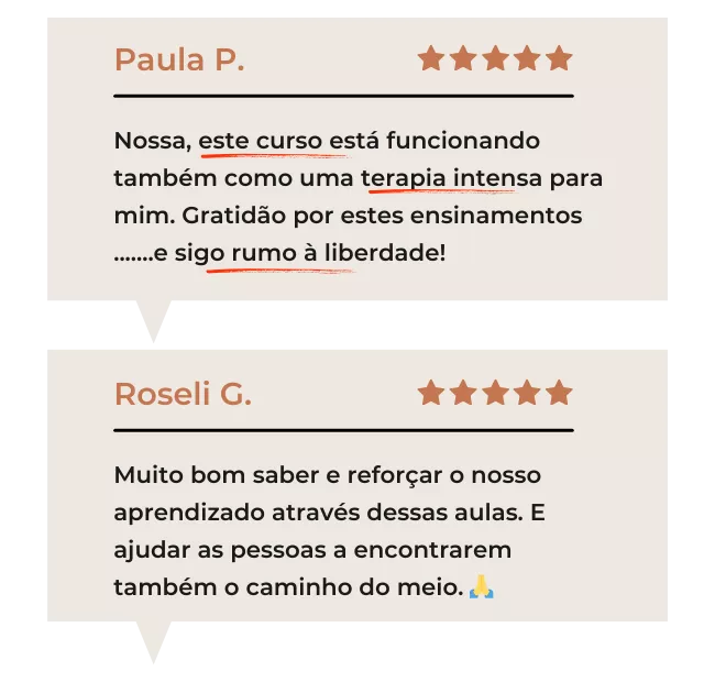 Agora, pela primeira vez, ela compartilha todo esse conhecimento em um curso 100% online, para que você possa ouvir o seu corpo, entender suas emoções e viver com mais saúde, paz e prosperidade.