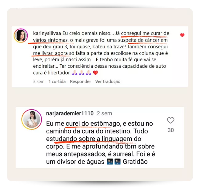 No final do curso, você será capaz de interpretar as mensagens do seu corpo, curar padrões emocionais profundos e viver com mais saúde, paz e propósito.