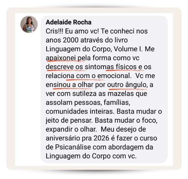 Ao aprender a linguagem do próprio corpo, ela acessou feridas profundas e iniciou um processo real de cura e libertação emocional.