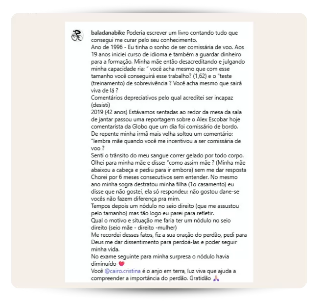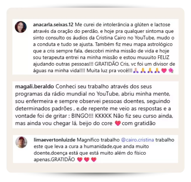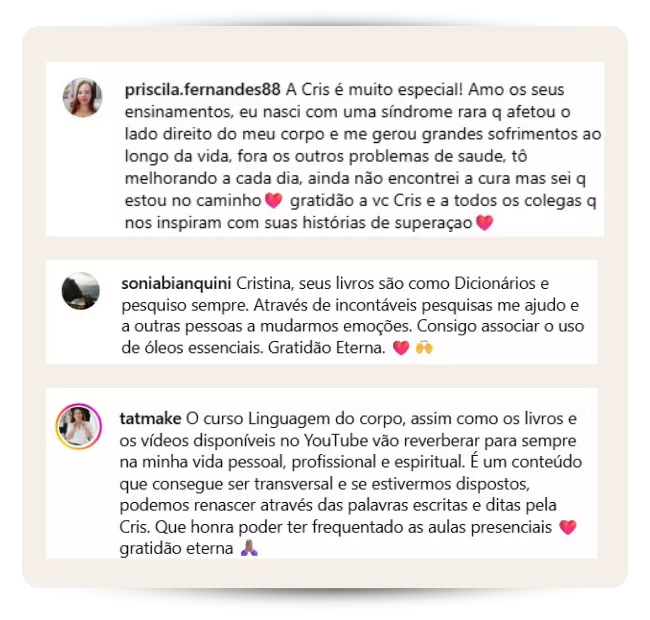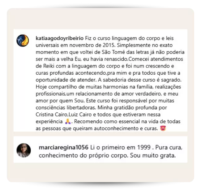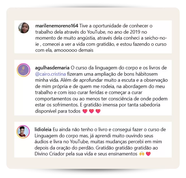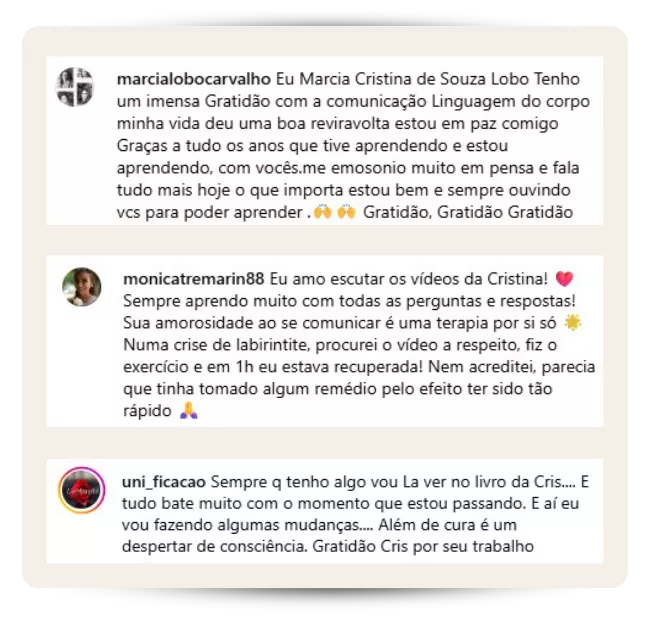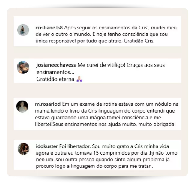 A Linguagem do Corpo - Método C.A.I.R.O. criado pela Cristina Cairo, é um caminho complementar de autoconhecimento, que ensina você a compreender as mensagens emocionais por trás dos sintomas físicos, para que possa buscar a cura integral — corpo, mente e espírito.