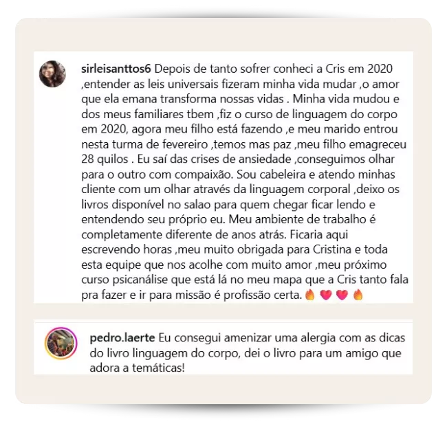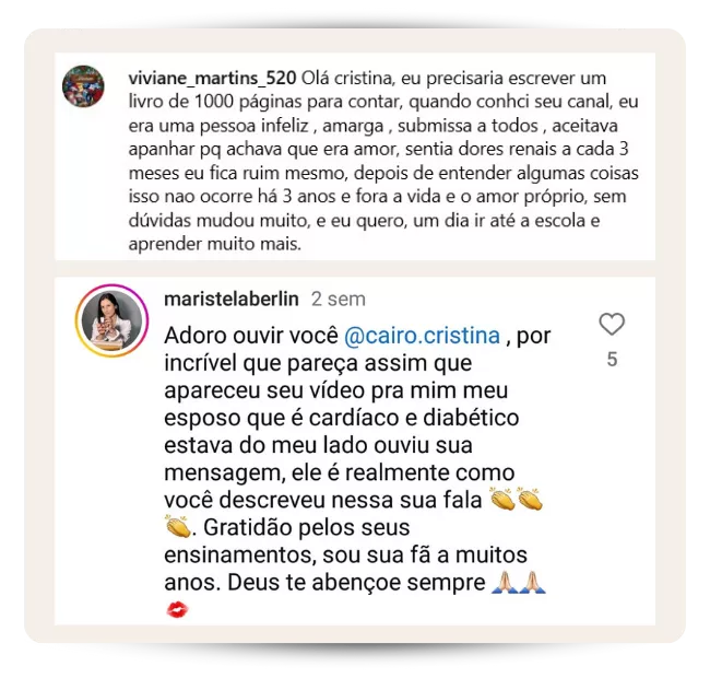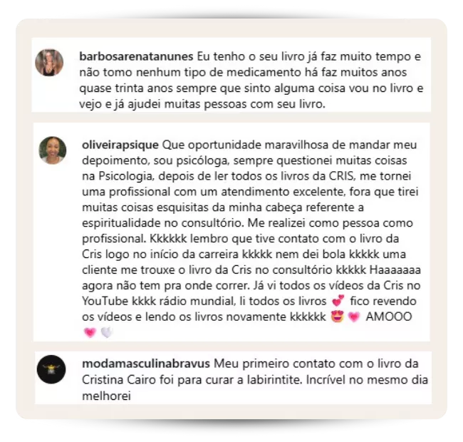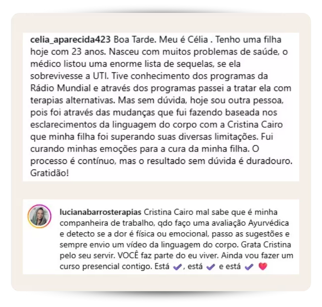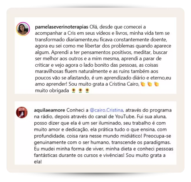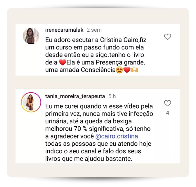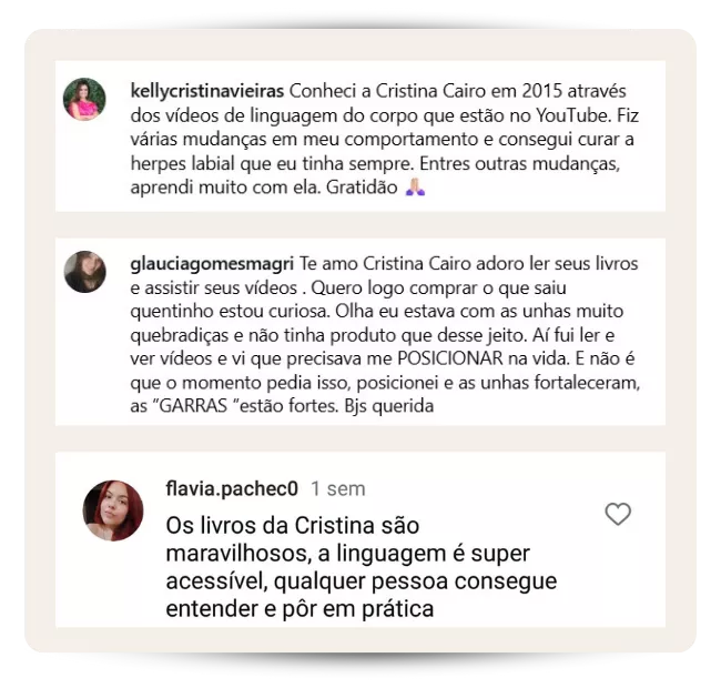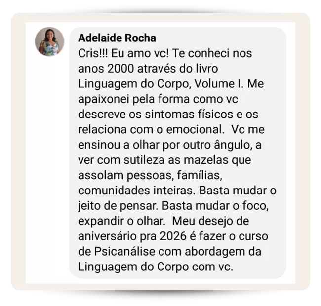 Cristina Cairo é a pioneira na Linguagem do Corpo no Brasil e conhecida mundialmente. Autora best-seller, fundadora da Escola Brasileira de Linguagem do Corpo e de uma maneira única, integrou ciência, espiritualidade e sabedoria ancestral, ela dedica sua vida a ajudar pessoas a compreenderem as mensagens do corpo e curarem doenças físicas e emocionais.