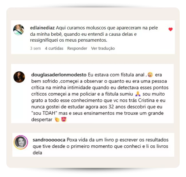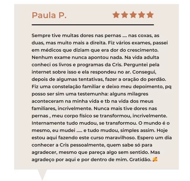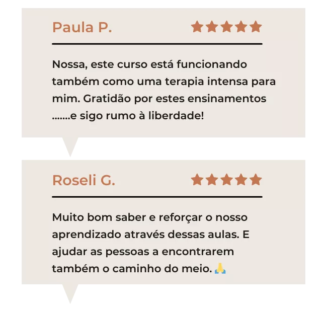 Agora, pela primeira vez, ela compartilha todo esse conhecimento em um curso 100% online, para que você possa ouvir o seu corpo, entender suas emoções e viver com mais saúde, paz e prosperidade.