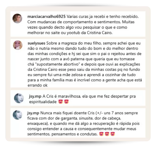 Este método exclusivo, desenvolvido por Cristina Cairo, vai muito além da meditação ou terapias convencionais. Ele é uma verdadeira ferramenta de cura e autotransformação que trabalha com a linguagem do corpo para trazer equilíbrio, saúde emocional e física, prosperidade e harmonia para todos os aspectos da sua vida.